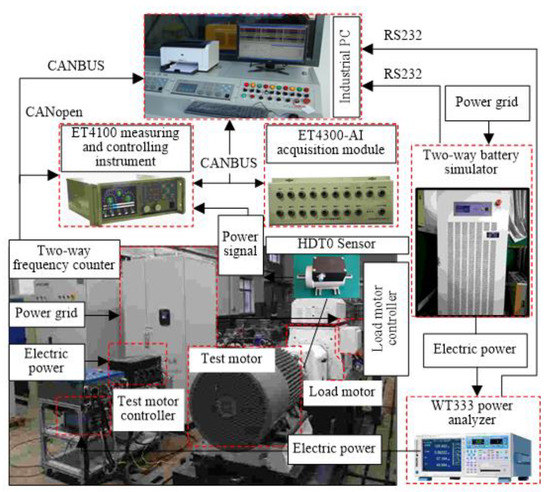 During the test, WT333 power analyzer, ET4100 measurement and control instrument, and ET4300-AI data acquisition module are used to collect and process the input electrical power signal and output mechanical power signal, respectively. Table 2 lists the main parameters of the hardware equipment. The communication interfaces are as shown in Figure 5, in which the two-way battery simulator on the tested motor side and the two-way variable frequency control cabinet on the loaded motor side are both powered by the power grid; the torque and speed of the BLDC motor are measured by a HDT05 torque-speed integrated sensor, and the mechanical power of the BLDC motor is obtained by data processing. The load torque and speed are closed-loop controlled by the digital segmented PID method through the ET4100 measurement and control instrument, and the input electric power signals at both ends of the motor controller are measured by the WT333 Power Analyzer to obtain the energy efficiency of the drive motor. With the use of the ET4100 measurement and control instrument, the load torque and speed are closed-loop controlled by the digital segmented PID method; the input electric power signals at both ends of the motor controller are measured by the WT333 Power Analyzer, and the energy use efficiency of the drive motor is obtained. is calculated by using Equations (28)–(30). Then, regression analysis on each group’s corrected discrete measurement data is performed using the least squares method to obtain continuous test control results.