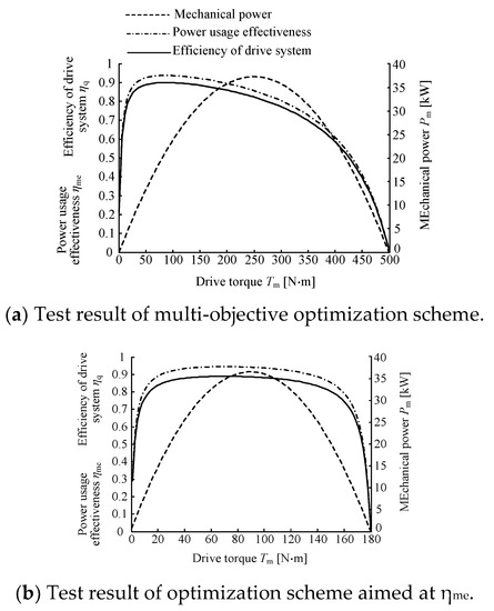 - The test results show that for the tractor model in the optimization example, compared with the control group, the proposed multi-objective optimization method can make the overall tractor system efficiency the highest, and the maximum and rated values of the total efficiency of the drive system of the multi-objective optimization design scheme. Compared with the optimal design scheme with as a single objective, it is increased by 2% and 1.4%, respectively, and compared with the optimal design scheme with as a single objective; it improved by 26.5% and 73.6%, respectively. It can provide an effective calculation method for the motor design problem in the subsequent development of the tractor electromechanical drive system.