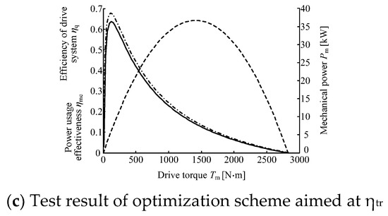 Figure 6 shows the loading test results of the different optimization results. As can be seen from the figure, in Equations (25) and (27), can characterize the heat loss rate. The mechanical power at the rated torque point of each scheme is equal to 36.8 kW. First, with as the target design, the maximum values of drive motors and are 94.5% and 88%, respectively; and of the rated torque point are 94% and 86.2%, respectively. Then, with as the target design, the maximum values of the drive motors and are 69% and 63.5%, respectively; the rated torque points and are 15% and 14%, respectively. With the use of the multi-objective optimization design scheme, the maximum value of drive motors and are 93.7% and 90%, respectively; rated torque point and are 88.5% and 87.6%, respectively. By comparison, the electric tractor motor designed only for the purpose of improving transmission efficiency exhibits reduced performance due to ; the heat loss increases because of a quadratic polynomial function relationship with the increase in the rated torque, which exceeds the transmission efficiency increase speed of Equation (28). Not only is reduced, but a large heat loss also occurs, resulting in serious heat generation of the motor and reduced reliability. The electric tractor motor designed to improve the motor energy efficiency of the drive motor has the highest maximum and rated values of , the lowest heat loss rate, and the smallest heat generation. The rated power of the tractor is proportional to the rated traction force; therefore, the maximum speed is relatively stable. Low-power electric tractors have a relatively low rated traction force, and increasing the motor’s rated torque is not obvious for the improvement of transmission efficiency, which is why a high-speed motor is used as the drive motor. High-power tractors have a highly rated traction force, a complicated transmission system, and low efficiency.