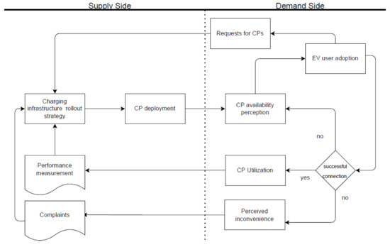 In the EV system, we see feedback loops, related to policy makers’ charging point deployment strategies (see Figure 1) [47]. Policy makers’ decisions on where and when to deploy CPs may include actual requests for CPs by EV owners, complaints from both EV and non-EV users, and key performance metrics (KPIs), based on charging data [9,48]. Policy makers may use CP performance metrics from charging data to evaluate decisions for CP locations [48,49]. This creates a feedback loop that may reinforce deployment decisions, even though policy makers may not have the full information on the system state [50]. We also observe a feedback loop within the system, related to the demand side population growth, as the existence of CPs in an area has found attract new EV users [1]. An increase of EV users will result in an increase of interactions and, hence, affect the other feedback loops. On the other hand, negative experiences with EV charging may result in EV users selling or not replacing their EV [51].