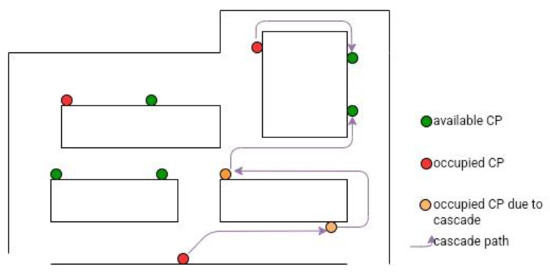 Earlier research on the vulnerability of charging infrastructure has shown that a disturbance in the system, either a malfunctioning or unexpectedly occupied charging station, can cause a cascade of failures in the system (illustrated in Figure 3) [18]. Simulation models of EV user charging behavior have shown that the number of failed connection attempts to an EV system is sensitive to changes in the number of users for a given size of the infrastructure under relaxed circumstances (limited users and without noise) [71].