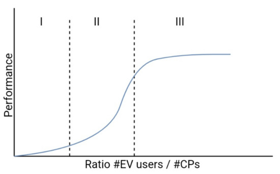 Recent literature has found non-linearity when scaling the EV system in the supply side, as well as in the ratio of supply versus demand. More specifically, three types of regimes may be present in the EV system during scale up: (i) a linear regime in the early stages, (ii) nonlinear increase of performance (due to economies of scale), and (iii) nonlinear decrease of performance (due to competition effects) (as illustrated in Figure 4). Regarding the scaling of the supply side, we see economies of scale, due to network formation, as the density of the charging network increases [50,78]. As the network density increases, these economies of scale lead to a marginal decrease of the performance metrics and exponential increase of inconvenience for EV users, due to CP occupancy. Recent research, that involved the addition of new EV users to an existing charging infrastructure, revealed that performance metrics growth marginally decreased towards a maximum, while failed connection attempts increased exponentially [71].