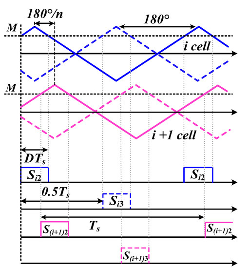 The modulation waveforms of unit i and unit i + 1 are shown in Figure 2. For the CHB of N units, the carrier phase difference between the left and right bridge arms of each unit is 180°, and the carrier phase difference between the bridge arms of adjacent units is 180°/n,