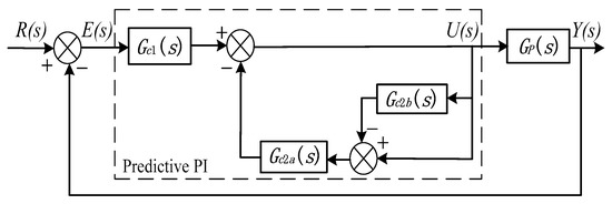 The predictive PI control algorithm combines the predictive strategy with the traditional PI control method, and introduces the relevant closed-loop transfer function into the traditional PI control algorithm, so that the whole control strategy not only has the advantages of easy realization of the PI controller, but also has a predictive function. In the face of the first-order inertia lag model, the predictive PI control algorithm can improve the delay of the controlled object and optimize the whole control process effectively. Moreover, the predictive PI controller has excellent robustness and stability. When the actual model parameters of the controlled object change in a certain range, it can also ensure the good performance of the negative feedback system [23,24]. The schematic diagram of predictive PI control is shown in Figure 4.