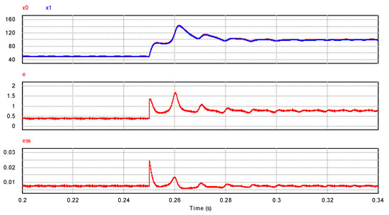 Figure 6 shows the error and absolute error between the actual value and predicted value of the PI control, where x0 is the actual output value of PI, x1 is the predicted value of PI, e is the absolute error between the predicted value x1 and the actual value x0, and ess is the relative error between the predicted value x1 and the actual value x0. It can be seen that the predicted value x1 tracked the actual value x0 well. In steady state, the absolute error and relative error are very small. At 0.25 s, the system load changes, the absolute error and relative error fluctuate, but after 0.04 s adjustment, it is stable.