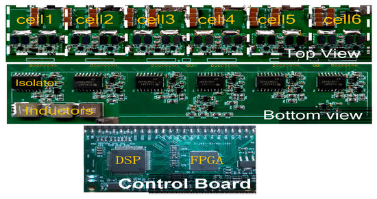The experiment adopted a PFC prototype with a rated power of 2 kW, the main circuit adopted a CHB topology of six units, the switch adopted a 100 V 4 mΩ gallium nitride device, and the control chip was composed of DSP and FPGA. The picture of the main circuit and control circuit of the experimental prototype is shown in Figure 9. Important components and models used in the prototype are shown in Table 1. Experimental parameters used in the prototype are shown in Table 2.