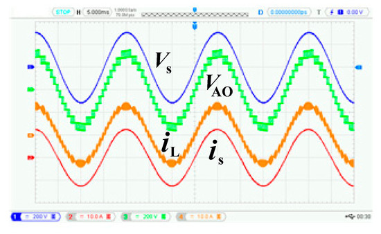 Figure 10 is the system steady-state experimental waveform where vs. is the power supply voltage at the AC side of the system; VAO is the bus voltage at the AC side of the system; and is is the bus current at the AC side of the system and iL is the current of boost inductor L. Figure 11 is the system switching cycle waveform. Ts is the normal switching cycle of each switch, and Tcs is the switching period of each switch after carrier phase-shifting modulation.
