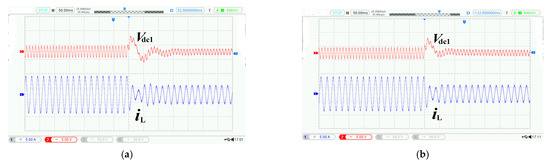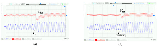 Figure 13 is the experimental waveform. Vdc1 is the voltage of the output capacitor C1, and iL is the current of boost inductor L. It shows the load from 72 Ω changed to 144 Ω. The response of output voltage and input current was obtained. After the system was put into operation, when the load changed abruptly from 72 Ω to 144 Ω, it can be seen from Figure 13a that under the conventional PI double loop control, the output voltage overshoot was large, and it reached a new stable state after about 0.15 s of adjustment; After 0.1 s adjustment, the output current reached a new stable state. It can be seen from Figure 13b that under predictive PI control, the output voltage overshoot was relatively small and reached a new stable state after about 0.075 s of adjustment; the output current reached a new stable state after 0.05 s of adjustment. Through the previous comparison, it can be seen that the system adopted predictive PI control; in the case of load mutation, the overshoot was small, and the dynamic performance was significantly improved.