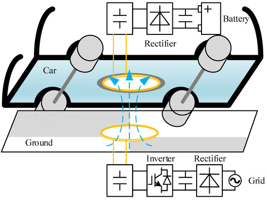 The shields are covered on the outside of the coils to make the magnet field gather between them. For the secondary shield using the soft magnetic material, this can be seen as a double-layer shield since this shield is combined with the chassis, which is always made from a hard magnetic material such as the aluminum alloy. The basic structure of the WPT system is shown in Figure 1.