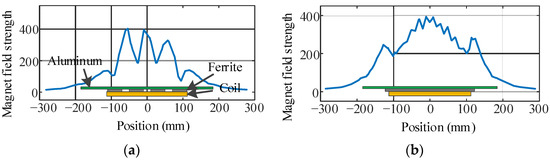 Compared with the secondary side of the coupler, the chassis is large enough to set up the secondary side. The transfer efficiency is mainly affected by the structure of the inner layer of soft magnetic material. Considering the limited cost and space under the chassis, the ferrite strips are always adopted as the inner layer. The magnetic field strength curves at the outside of the 5 mm secondary shield are shown in Figure 2, and the basic parameters of the adopted materials are listed in Table 1. The Mn-Zn ferrite is a soft magnetic material compared with aluminum due to its larger permeability, and these two materials have different main working frequency ranges to shield the magnetic field with different frequencies. Most of the magnet fields are gathered between the shields, but some leaking magnetic fields enter the outer space through the gaps among the strips. The structure of these strips has a strong relationship with the transfer efficiency.
