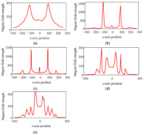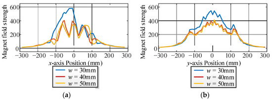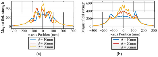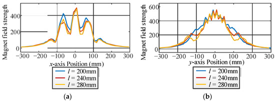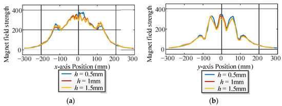 Magnet field strength curves for different directions of the inner soft magnetic strips. (a) x-axis. (b) y-axis.