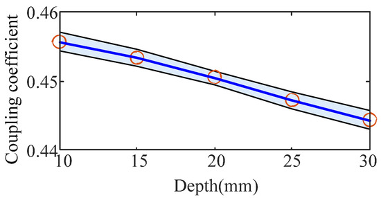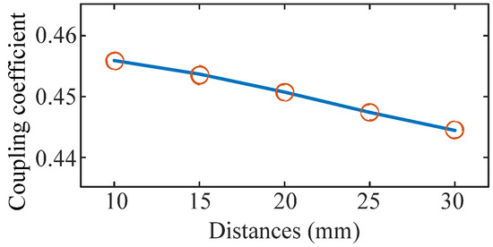 Finite element analysis is a kind of mathematical simulation method to estimate real physical systems by some simple and related units. The distance between the strips is selected as being from 10 mm to 30 mm, and their magnet field strength on the x-axis and y-axis are shown in Figure 5, respectively. According to these waves by the finite element analysis software, the magnet fields overflow and enter the outer space by the gaps between the strips. The waveform of the coupling coefficient k is shown in Figure 6. It can be seen that the maximum magnetic field strength by the overflowed field is increased and the coupling coefficient is decreased with the increment in the distance.