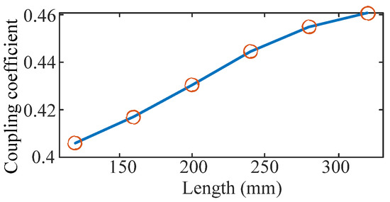 The length of the strips is tested from 120 mm to 320 mm. The waveforms of the magnet field strength and the coupling coefficient are shown in Figure 8 and Figure 9, respectively. According to these waveforms, the maximum magnetic field strength of the overflowed magnet field is decreased and the coupling coefficient is increased with the increment in the length.