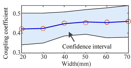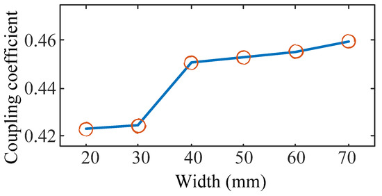 The width of the strips is tested from 20 mm to 70 mm. The waveforms of the magnet field strength and the coupling coefficient are shown in Figure 11 and Figure 12, respectively, where N = 6 when the width equals 20 mm and 30 mm according to Equation (1). The maximum magnetic field strength of the overflowed magnet field is decreased and the coupling coefficient is increased with the increment in the width. Moreover, the coupling coefficient has an obvious decrement when N equals 6, and the transfer efficiency is influenced by the value of N.