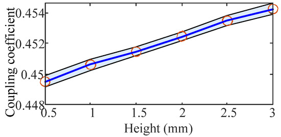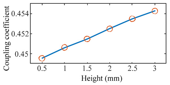 The length of the strips is tested from 0.5 mm to 3 mm. The waveforms of the magnet field strength and the coupling coefficient are shown in Figure 14 and Figure 15, respectively. According to these waveforms, the maximum magnetic field strength of the overflowed magnet field is weakly decreased and the coupling coefficient is increased with the increment in the height.