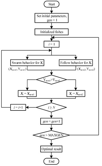 where X = (x1,x2,…,xn), Xv = (xv1,xv2,…,xvn), r is a random value within (−1, 1), n is the number of variables. Under the conditions of structure optimization, n is the same as the number of parameters. The flowchart of the AFSA is shown in Figure 18, where MAXGEN is the maximum number of iterations.