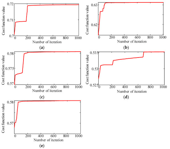 Curves of the cost function value. (a) N = 2, (b) N = 4, (c) N = 6, (d) N = 8, (e) N = 10.