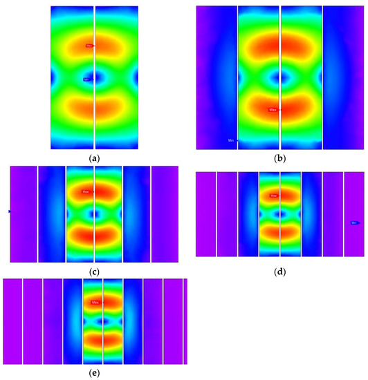 According to Figure 21, an interesting phenomenon appears in that the strength that enters the outer space through the gaps among the strips (excepting the center gap) becomes a major problem if N belongs to (4,6). However, this problem is gradually eliminated with the further increasing number of strips.