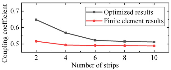 The finite element results are summarized in Table 5, and the comparison of the coupling coefficients between the optimized results and finite element results are shown in Figure 22. According to the results in the figures and table, the coupling coefficient is decreased with the decrement in the number of strips, which basically confirms the trend in Table 4. These coefficients are the largest values comparing the curves in Figure 6, Figure 9, Figure 13 and Figure 15, and an optimal structure is found to improve the efficiency. The decreasing trend of the coupling coefficient of the finite element analyses is slower than the trend in Table 6. The reason for this phenomenon is that the accuracies of the optimal parameters are limited because these predicted parameters are located out of the tested ranges. The limitation of the accuracy can be improved if the selected testing ranges of the parameters in Section 3 are enlarged and the number of testing points is increased.