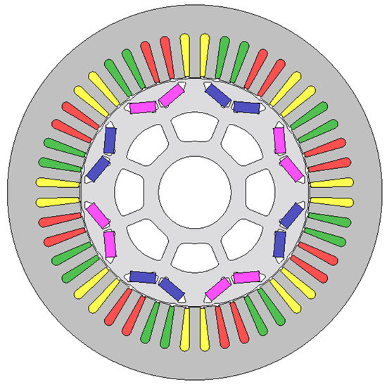 The Toyota Prius 2010 IPM machine is well known for its excellent performance and has been investigated by researchers all over the world in recent years [39,40,41]. The cross-section of the machine with a 48-slot stator and an 8-pole V-type IPM rotor is presented in Figure 1.