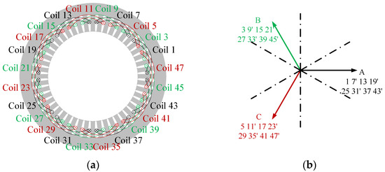The stator windings equipped in the Toyota Prius 2010 PM machine are 5-slot-pitched single layer three-phase windings, as shown in Figure 2a. In 48-slot/8-pole IPM machines, the number of slots per pole is 6. Hence, the original windings in the Toyota Prius 2010 IPM machine are short-pitched windings, which can reduce MMF harmonics and end-winding length. The diagram of coil electromotive force (EMF) phasors is given in Figure 2b. It can be seen that there is no phase shift between the coil EMF phasors of the same phase. In other words, the original three-phase windings cannot be transferred into two three-phase windings with a 30° phase shift.