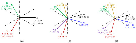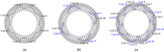 In the ORG machine, as shown in Figure 3a, the coils of Phase A are Coils 1, 7, 13, 19, 25, 31, 37, and 43. The interval between adjacent coils is 8 slot pitches in space, which is 180° in electrical degree. Compared with Coils 1, 13, 25, and 37, Coils 7, 19, 31, and 43 are opposite connected. Thus, all the coils of Phase A in the ORG machine share the same back EMF phases, as shown in Figure 2b. In the DTP-SF machine, the coil pitch number is 6 slot pitches instead of 5 slot pitches in ORG and DTP-DS machines. The detailed winding layouts of the DTP-SF winding configuration are shown in Figure 3b. It can be seen that the distance between Coil 1 and Coil 48 is one slot pitch in space, which is 30° electrical degrees. In other words, the back EMFs induced in Coil 48 are ahead of that in Coil 1 by 30°. Similarly, the back EMFs induced in Coils 12, 24, and 36 are advanced to those in Coils 13, 25, and 37 by 30°. In DTP-SF windings, Phase A1 is composed of Coils 48, 12, 24, and 36, and Phase A2 is composed of Coils 1, 13, 25, and 37. Thus, Phase A1 is ahead of Phase A2 by 30°. In the DTP-DS machine, the original windings are duplicated, and the new winding set is shifted by one slot pitch, as shown in Figure 3c. The coils of Phase A in the ORG machine, Coils 1, 7, 13, 19, 25, 31, 37, and 43, belong to Phase A1 in the DTP-DS machine, and the new Coils 2, 8, 14, 20, 26, 32, 38, and 44 belong to Phase A2. Thus, all the coils of Phase A2 lag behind those of Phase A1 by one slot pitch, which means that the back EMF of Phase A2 is lag to that of Phase A1 by 30° in time. Overall, the resultant stator winding arrangements of ORG, DTP-SF, and DTP-DS winding configurations are shown in Figure 4a–c. The coil EMF phasor diagrams of these winding configurations are shown in Figure 5a–c.