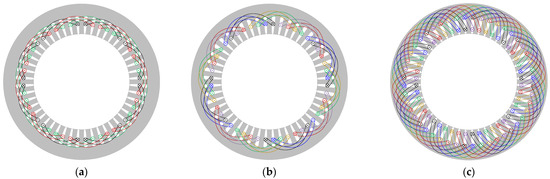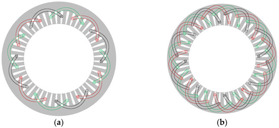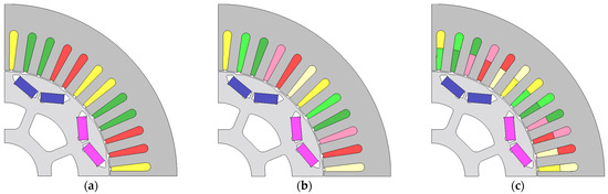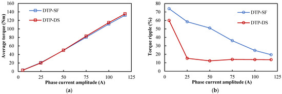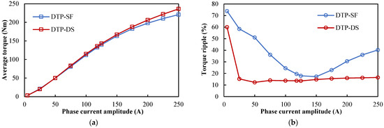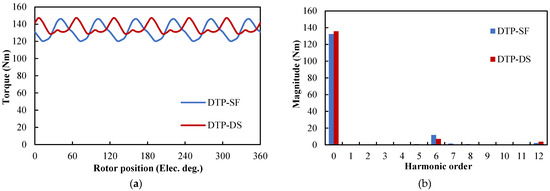 • Lower torque ripple. The specific torque harmonics produced by the two winding sets can be cancelled with each other, and the stator magnetomotive force (MMF) harmonics are significantly reduced by DTP windings [9,14,22];