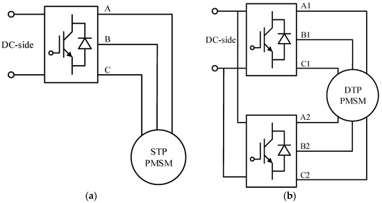Besides the advantages listed above, the ratings per phase are reduced with the increase in phase number. The vibration of PWM frequency can also be reduced by two parallel inverters in a DTP machine [31,32,33,34]. Moreover, the two winding sets provide more control freedoms in a machine system, and thus, more control strategies can be utilized, and the performance of DTP machines can be further improved [35].