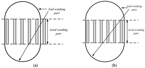 However, the total winding length is relatively difficult to compute directly because the lengths of different coils are different according to the position of their two sides in the slot. In this paper, to simplify the calculation, all coil sides are assumed at the center of slots. Thus, the total winding length can be estimated from the total number of turns in series per phase and the length of each turn. The number of coils per phase and the number of turns per coil are provided in Table 2. It can be found that the three winding configurations share the same number of turns in series per phase, which is 88. Thus, the resultant total winding length is proportional to the length of each turn.