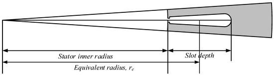It can be seen that both coils can be divided into two parts: the axial winding part and the end-winding part. The length of the axial winding part is the stator’s axial length. The length of the end-winding part can be calculated based on the stator’s inner diameter, slot depth, and coil pitch number, and these data be found in Table 1. Since all coil sides are assumed to be at the center of slots, the equivalent radius of each coil side, re, is the sum of the stator’s inner radius and a half of the slot depth, as shown in Figure 8.