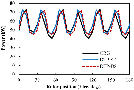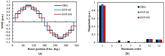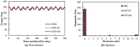 The ideal stator MMF distributions for ORG, DTP-SF, and DTP-DS winding configurations are calculated to illustrate the influences of the shifting windings on resultant stator MMF harmonics. The waveforms and spectra of ideal stator MMF distributions are shown in Figure 10a,b, respectively. Although ORG and DTP-DS winding configurations have different stator MMF distribution waveforms, the amplitudes of the fundamental components in the two windings are identical. Compared with ORG and DTP-DS counterparts, the amplitude of the fundamental component in the DTP-SF winding configuration is higher, which agrees well with the calculated winding factors shown in Table 4. What is more, it can be seen that there are no fifth and seventh harmonics in DTP-SF and DTP-DS winding configurations from Figure 10b because these harmonics are eliminated by the two winding sets with a 30° phase shift. Furthermore, it can be inferred that the sixth torque pulsations can be totally eliminated in DTP-SF and DTP-DS machines [23].