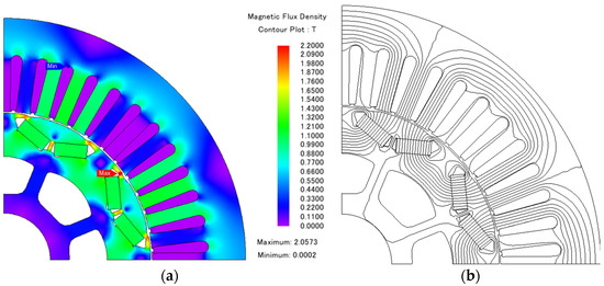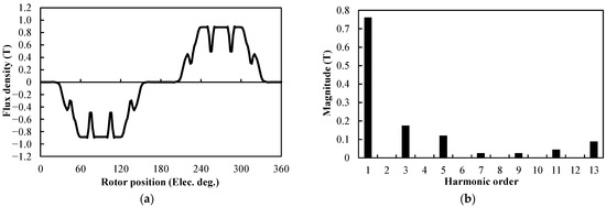 Under OC conditions, all the flux in the machine is provided by permanent magnets in the rotor. Thus, different winding configurations have no influence on flux distribution performance. The flux density contour and the flux line distribution of the Prius 2010 machine under OC conditions are plotted in Figure 11a,b, respectively. The air-gap flux density waveform and its spectrum in the machine are shown in Figure 12a,b, respectively.