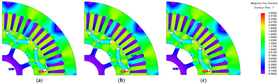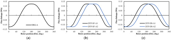 Although different winding configurations cannot affect the flux distribution performance of the machine under OC conditions, their flux linkages are different. The phase flux linkages of different winding configurations are presented in Figure 13a–c.