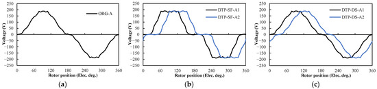 For all winding configurations, the winding factor is the product of the distribution factor and the pitch factor. The distribution factors can be obtained from the coil EMF phasor diagrams shown in Figure 5, and the pitch factors are determined by slot/pole number combination and coil pitch number. In Figure 5a–c, it can be seen that the EMF phasors of the same phase overlap each other. Thus, the distribution factors of the three winding configurations are all 1. Pitch factors are the ratio of coil-pitch to pole-pitch. For the full-pitched windings in the DTP-SF machine, the pitch factor is 1. For the short-pitched windings in ORG and DTP-DS machines, the pitch factors are 0.966. Then, the winding factors of different winding configurations are calculated and listed in Table 4.