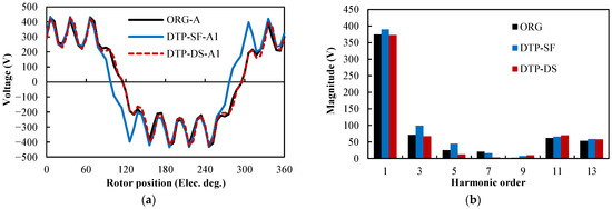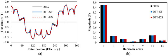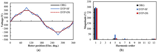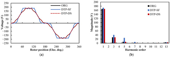 The waveforms and spectra of phase back EMFs with different winding configurations are compared in Figure 15. In Figure 15a, the back EMF curve of ORG windings is totally overlapped with that of DTP-DS windings. The spectra of these back EMFs are given in Figure 15b. For DTP-SF winding configuration, the magnitudes of the first, fifth, and seventh harmonics are higher than those in the ORG machine. To be more specific, the fundamental component is increased by about 3.53%, which validates the calculation of winding factors, as shown in Table 4. From Figure 15, it also can be seen that the harmonic contents in ORG and DTP-DS windings are identical.