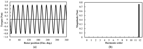 As cogging torque is not associated with armature currents, different winding configurations share the same cogging torque characteristic. The waveform and spectrum of the cogging torque in the Prius 2010 machine are shown in Figure 17a,b, respectively. It is illustrated that the dominant harmonic in cogging torque is the twelfth harmonic, which is the least common multiple between the slot number and pole pair number for a 48-slot/8-pole machine.