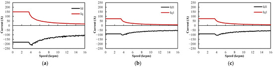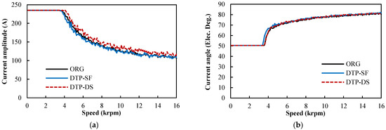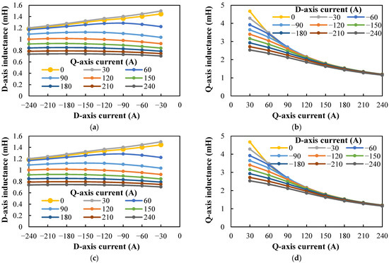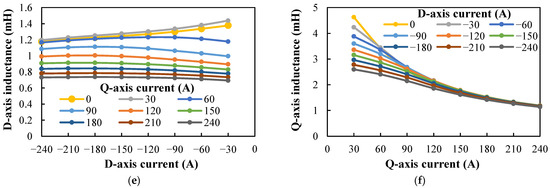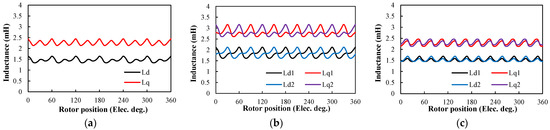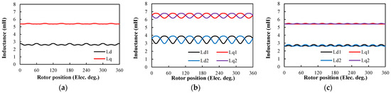 The inductance characteristics of different winding configurations under OC conditions can also be obtained from these models. The d- and q-axis inductances of these winding configurations are shown in Figure 18a–c. It should be noticed that the frozen permeability method is utilized to improve the accuracy in inductance calculations, and the details can be found in [44]. From Figure 18a,c, it can be observed that the inductance characteristics of each winding set in DTP-DS windings are very similar to that of ORG windings. The oscillations of d- and q-axis inductances in DTP-SF windings are much larger than those in ORG and DTP-DS windings.