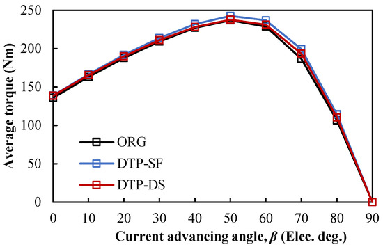 To produce the largest torque, the maximum phase currents are employed, which are 236 Apk in ORG windings and 118 Apk in DTP-SF and DTP-DS windings. In ORG windings, the current advancing angle is a variable, β. In DTP-SF and DTP-DS windings, the current advancing angles for the two winding sets are β1 and β2, respectively. Since β1 and β2 are displaced by 30°, it can be assumed that β1 = β + 15° and β2 = β − 15°. Then, the output torques of STP and DTP machines are all varied with only β. The average torque-current advancing angle characteristics of different winding configurations are shown in Figure 19, and the specific values are given in Table 5. It can be seen that the maximum output torque is obtained when β = 50° for all winding configurations. This indicates that both DTP-SF and DTP-DS winding configurations do not change the optimal current advancing angle in the ORG machine. In other words, the optimal current advancing angle in the ORG machine can be utilized directly in DTP machines.