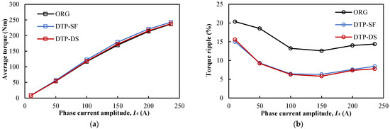 For the DTP-DS winding configuration, although it shares identical winding factors with the ORG counterpart, the torque characteristics of the two winding configurations are not the same. The average torque of the DTP-DS machine is slightly higher than that of the ORG counterpart. In other words, the average torque in the ORG machine can be improved slightly using the DTP-DS winding configuration.