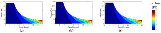 The detailed characteristics of the magnets in the machine are investigated and provided in [41]. The intrinsic hysteresis graphs of the magnets are plotted in [41], considering different temperatures. The diminishing nature of the remanent flux density and coercivity with increasing temperature can be observed. However, in this paper, the simulations are calculated using JMAG-Designer, which is a simulation software for the development and design of electrical devices provided by JSOL [42]. To simplify the calculation in simulations, the ideal permanent magnet material ‘NdFeB_Br = 1.2T’ is chosen as the magnets in the JMAG model, and Br and µr of ‘NdFeB_Br = 1.2T’ are fixed at 1.2T and 1.05, respectively. Further, in the JMAG model, ‘35H270’ is chosen as the stator and rotor core materials, and the calculated iron losses in this paper are based on the properties of ‘35H270’ in JMAG software.