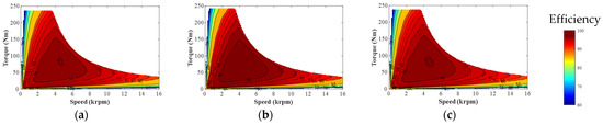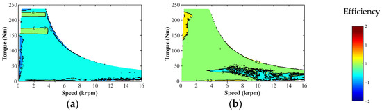 Besides the difference in winding arrangements, the drive system for DTP-SF and DTP-DS winding configurations is also different from the original one, as shown in Figure 6a,b. The original inverter is a three-phase six-switch voltage source inverter (VSI), and the DC-link voltage is rated at 650 Vdc. DTP machines are fed by two separate three-phase inverters, and the two inverters are parallel connected. Compared with the ORG machine, the input power of DTP machines is split into two winding sets. Considering that the two winding sets in DTP machines share the same DC-link voltage with the original windings, the phase currents in DTP windings can be halved from the original phase currents in ORG windings to produce equivalent power. In the ORG machine, the maximum torque is produced with 236 Apk peak phase currents. Compared with the original machine, the number of turns is doubled in DTP machines, and thus, phase currents should be halved to keep the same equivalent ampere-turns. In other words, to make the comparison fair, 118 Apk peak phase currents are utilized in DTP machines to produce the largest torque. Hence, the current requirement for DTP inverters can also be halved from the original value in the ORG machine. The lower current requirement suggests that cheaper power devices can be utilized in DTP inverters. Although the number of switches is doubled in the DTP drive system, the total cost of the DTP drive system is lower than twice the original cost. For example, according to the ‘IGBT Module Finder’ tool provided by Infineon Technologies [43], FS400R07A1E3 can be chosen for the ORG drive system, and FS200R07A1E3 can be chosen for DTP-SF and DTP-DS drive systems. Since both FS400R07A1E3 and FS200R07A1E3 are three-phase six-pack modules, only one module is needed in the ORG machine, and two modules are required in DTP machines. As ORG and DTP machines share the same DC-link properties, the difference in the prices of semiconductor modules is the only difference in the resulting cost of different drive systems.