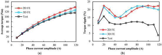 Based on the calculations shown above, it can be summarized that the total volumes of copper wires utilized in ORG and DTP-DS machines are identical because of the identical short-pitched windings equipped in them. However, the DTP-SF machine needs more copper wires—13.2% higher than the counterparts—due to the full-pitched windings. In other words, the cost of winding connections in the DTP-SF machine is higher than the other two counterparts. It should be mentioned that the analyses presented here are only based on estimations. The actual winding length and machine size can be further optimized in design and assembling processes. However, it can still be concluded that compared with the DTP-SF counterpart, the DTP-DS winding configuration has inherent advantages in winding resistance and machine size due to the short-pitched windings in it.