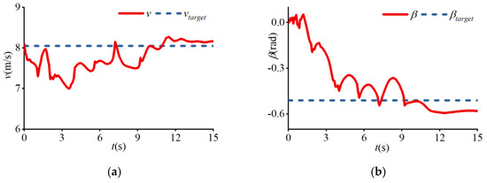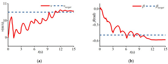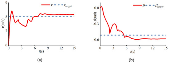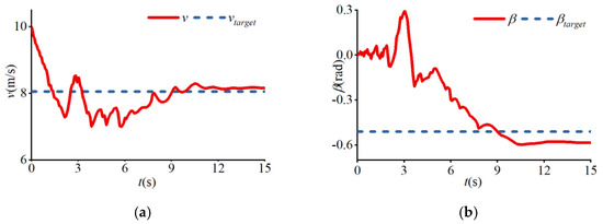 All original states were uniform linear motions with different velocities to verify the controller performance. The 6 m/s original velocity was lower than the target in group (c), the second original velocity equaled 10 m/s and was higher than the target in group (c), and the original velocity equaling 8.1 m/s was very close to the target in group (c), of which the main intention was to demonstrate that the designed controller can be used to realize the vehicle drifting motions with different no-limited original states. The last two simulations with 9 m/s and 13.7 m/s original velocities for the target groups (d) and (e), respectively, were to verify that the controller can realize more than just a target drifting motion.