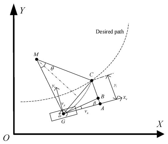 Driverless vehicles represent the key development direction of automobiles, and the path tracking control is one of the key technologies needed in order to realize the accurate path tracking and planning of driverless vehicles and ensure their safe and stable driving [1,2]. In the study of path tracking control, the control methods can be divided into pre-aim and non-pre-aim, according to the source of external information. In non-pre-aim control, a composite control strategy was used to design the path-tracking controller [3,4]; in order to solve the problem of accurate tracking in curves, an adaptive control method was applied [5]. Furthermore, in order to solve the problem of vehicle rollover caused by excessive roll angle during cornering, a roll angle constraint was added to the model predictive controller design to achieve the limitation of body roll angle, but the impact of the vehicle’s nonlinear characteristics on stability was not considered [6]. Most of the above studies use the feedback principle approach, which usually does not consider the driver’s predictive role in the “human–vehicle–road” system for vehicle maneuvering behavior. However, human drivers are used to making reasonable driving decisions by observing the road ahead during the driving process [7].