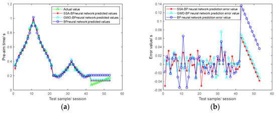 Using the direction-controlled driver model described in Section 3.2, different vehicle speeds, pre-aim distances, and pre-aim times were selected to perform tracking experiments on the reference path (U-turn path), and 20,012 sets of data with tracking errors within ±0.2 m of the pre-targeting control were used as training samples to train the SSA-BP neural network. The network training target was reached after 29 iterations with fast convergence; 53 sets of test samples were used to test the SSA-optimized network, and the results are shown in Figure 6. As can be seen from Table 1, the improved algorithm has a mean absolute error (MAE) of a root-mean-square error (RMSE) of , and a maximum error of . This pre-aim time regulator has high prediction accuracy; it can reduce the accumulated deviation caused by understeering during high-speed turns and improve the adaptability to cope with complex working conditions.