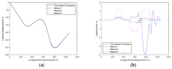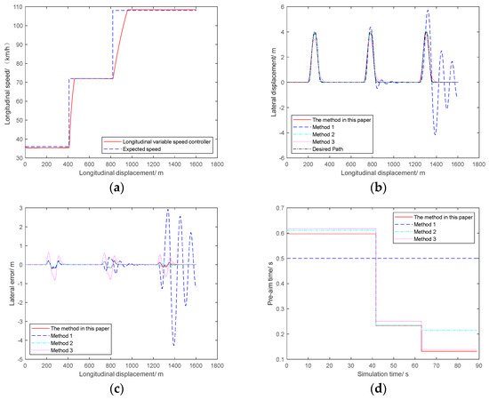 Furthermore, the tracking performance of the method in this paper was verified under variable-speed conditions. The vehicle was set to drive on a dry road at a speed of 36 km/h for 0–410 m, 72 km/h for 410–670 m, and finally accelerate to 108 km/h. Figure 9 shows the Alt 3 test road simulation results under variable-speed conditions. The method in this paper eliminates the accumulated error during driving by adaptively changing the pre-aim time under variable-speed conditions, which not only improves the path-tracking accuracy, but also reduces the chance of vehicle instability. The vehicle controlled by method 1 has a smoother tracking curve at the first curve, but at the exit of the second curve under the dual influence of vehicle acceleration and steering lag, the vehicle has a lateral error of 3.922 m and deviates from the road. Method 2 still has high tracking accuracy at low and medium speeds, but the tracking error fluctuates more at high speeds, and the stability of the controlled vehicle is insufficient.