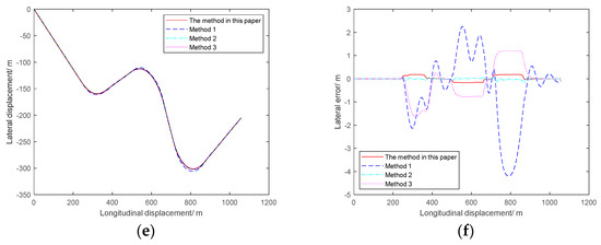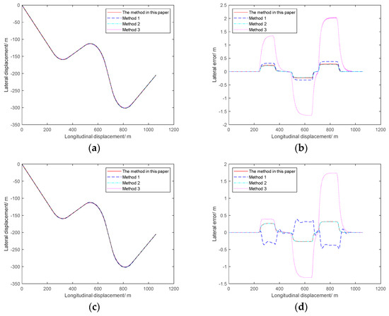 - The longitudinal variable-speed controller was designed to reduce the coupling effect of longitudinal speed on path tracking, making the method in this paper more adaptable to a wide range of speed variation and able to achieve accurate path tracking under a variety of variable-speed working conditions;