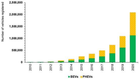 Moreover, in the EU the number of BEVs in 2010 was 5785. In 2020 this number reached 11,254,854, while the number of PHEVs was 3412 in 2010 and reached 967,721 in 2020 (as shown in