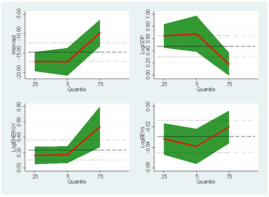 The results from simultaneous quantile regression indicate that in the 25th and 50th quantiles the variable LogGDP causes a positive effect on the variable LogCO2. Furthermore, the variable LogENERGY in the 25th, 50th, and 75th quantiles also causes a positive impact on the dependent variable. Therefore, both economic development and energy consumption increase CO2 emissions in the EU countries. In contrast, the variable LogBEVs in the 25th, 50th, and 75th quantiles cause a negative effect on the variable LogCO2. That is, battery EVs are capable of mitigating CO2 emissions.