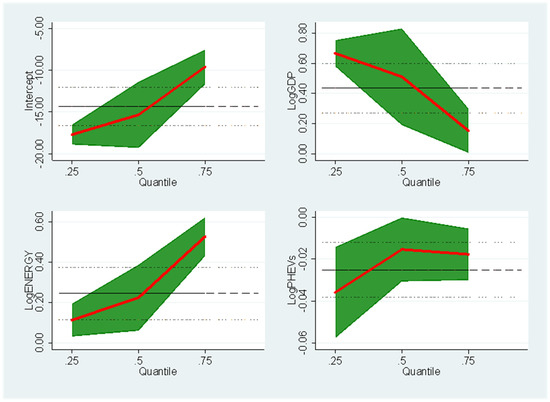Therefore, the results from simultaneous quantile regression indicate that in the 25th and 50th quantiles, the variable LogGDP causes a positive effect on the variable LogCO2. The variable LogENERGY in the 25th, 50th, and 75th quantiles also causes a positive impact on the dependent variable. Therefore, both economic development and energy consumption increase the emissions of CO2 in the EU countries. In contrast, the variable LogPHEVs in the 25th, 50th, and 75th quantiles cause a negative effect on the variable LogCO2. PHEVs can mitigate CO2 emissions but at a lower intensity than BEVs. The lower capacity of PHEVs to reduce CO2 emissions is related to the internal-combustion-engine-powered generator that these vehicles have. That is, in addition to recharging by plugging a charging cable into an external electric power source, these vehicles are also powered by fossil fuels (i.e., gasoline or diesel), which emit CO2. The Discussions section will better explain why PHEVs reduce CO2 emissions less than BEVs.